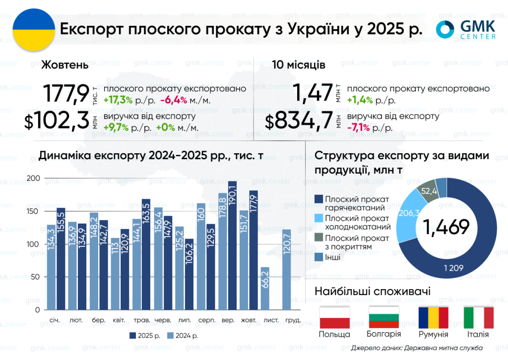 صادرات محصولات تخت فولادی اوکراین در دوره ژانویه تا اکتبر ۲۰۲۵ با رشد ۱.۴ درصدی نسبت به مدت مشابه سال ۲۰۲۴ به ۱.۴۶۹ میلیون تن رسید. این دادهها بر اساس محاسبات مرکز GMK و با استناد به آمار «سرویس گمرک دولتی اوکراین» منتشر شده است. بیش از ۸۲ درصد از این صادرات به ورق گرم تخت با کد HS 7208 اختصاص داشته که مجموعاً ۱.۲۱ میلیون تن بوده و در مقایسه سالانه کاهش ۰.۷ درصدی را نشان میدهد. در این مدت لهستان با ۴۸۱ هزار و ۲۷۰ تن، بلغارستان با ۳۴۰ هزار و ۲۳۰ تن و ایتالیا با ۷۳ هزار و ۳۵۰ تن بزرگترین واردکنندگان ورق گرم اوکراین بودند.